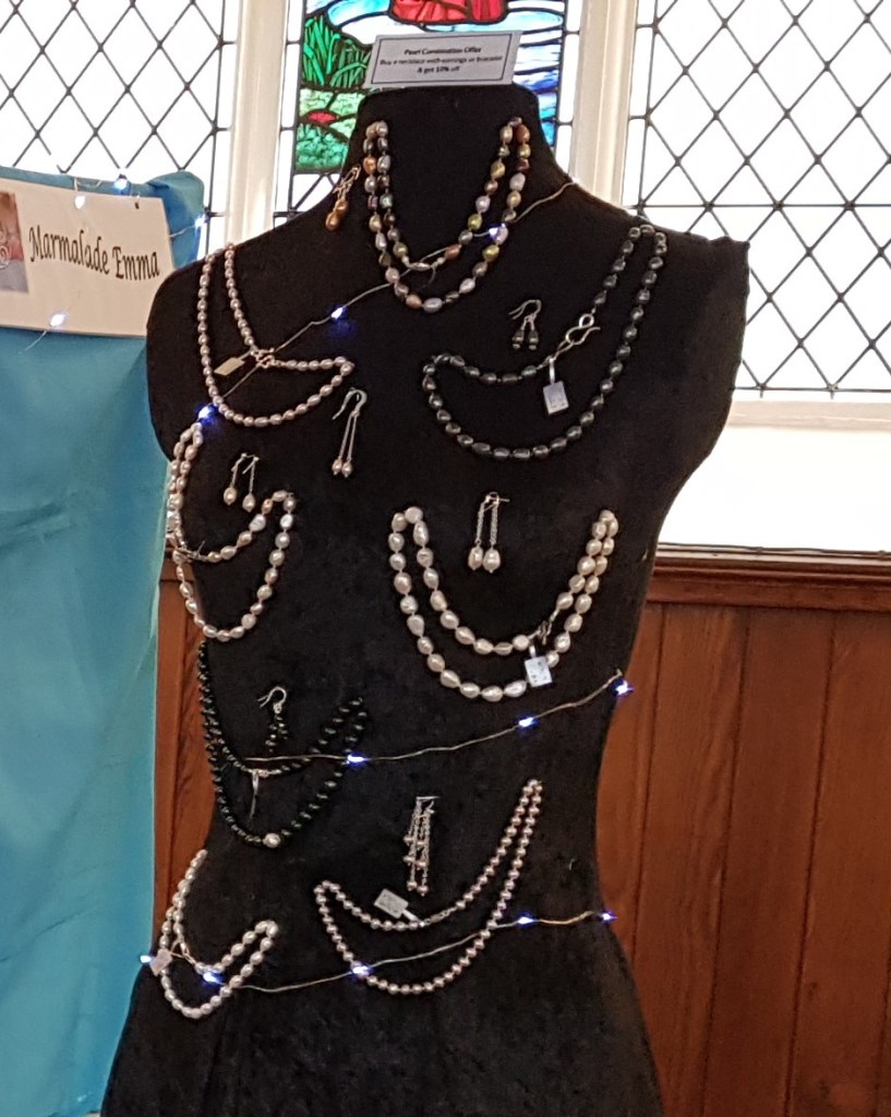 I had extra help this time – I took along an old friend, Jemima. I even made her a new dress for the occasion – a closely fitted black crushed velvet number with a full skirt. She stood silently by the table for the whole day, not moving an inch as she modelled pearl necklaces and earrings, carefully arranged in sets over her torso. I did ask about the pins (Ja min’ ma putting pins in ya?) but she’s never minded before and didn’t this time either. She’s coming with me next month too, she doesn’t get out much otherwise.