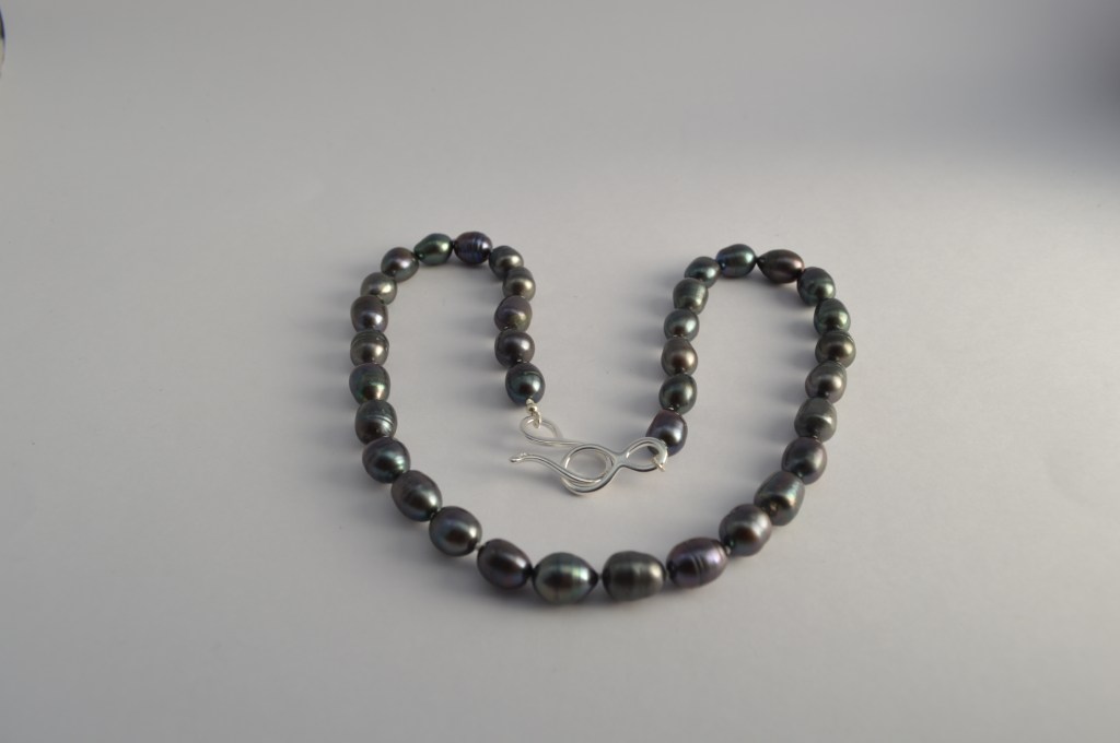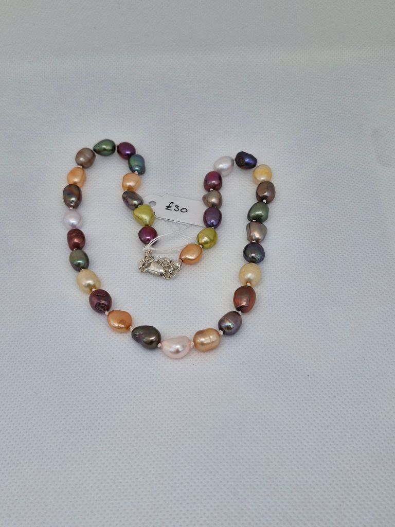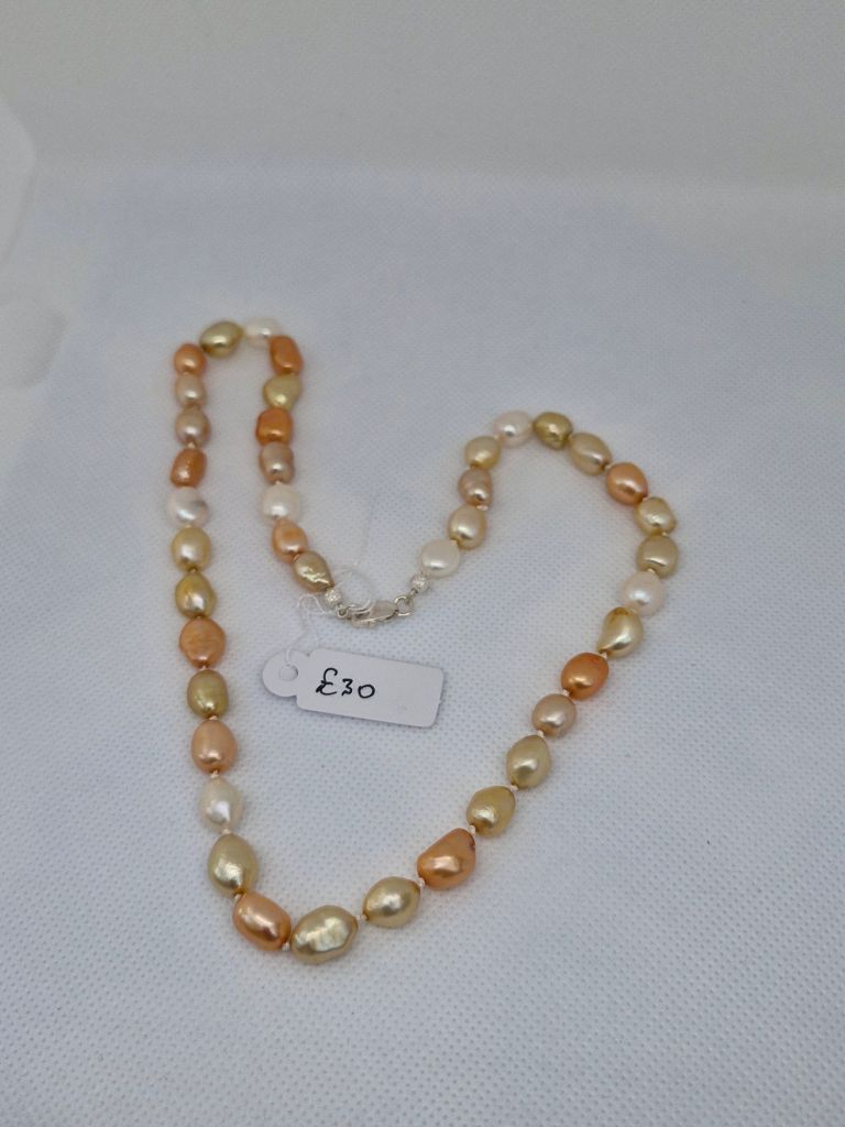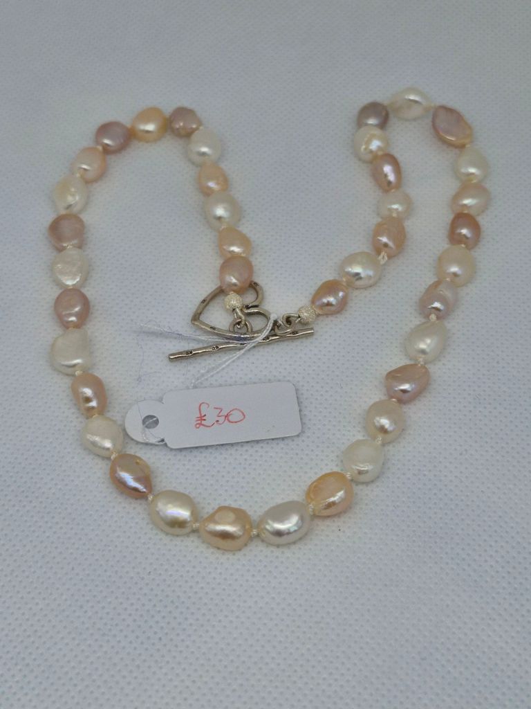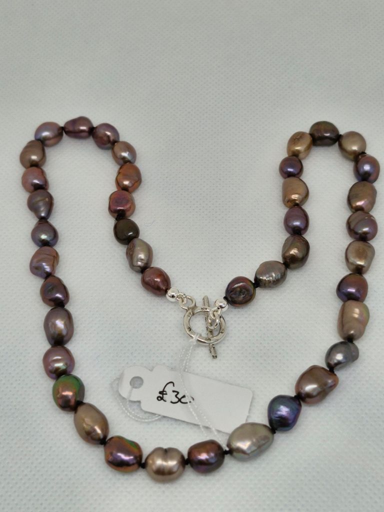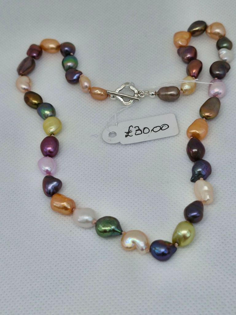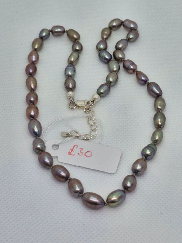 Multicolour baroque pearls £30Deep purple rice pearls £25Peacock pearls with hook clasp £40 1) Multicoloured baroque pearls £301) another view with length shown – 16″ + 2″ extension chain.2) Baroque pearls in beautiful shades of soft pink with a Hill Tribe Silver square toggle clasp. £302) close-up of the clasp & colours. This string is 20″ long3) Gorgeous oval ivory pearls with a round Hill Tribe Silver toggle clasp £303) Close up of the clasp. These are 19″ in length4) Very pale pinks, creams & apricots make a lovely baroque pearl necklace £304) This is a hammered square toggle clasp in sterling silver. The necklace is 17″ long5) Baroque pearls in cream, yellow and apricot with a plain sterling silver lobster clasp. £305) Sparkly beads finish off this 19″ string of pearls 6) Lime green rice pearls £256) 18″ of freshness fastened with a sterling silver lobster clasp. 7) Silver baroque pearls £30 (and there’s a bracelet to match if you’re interested, it’s £20)7) And extension chain will take this string from 16″ to 18″ of shiny luxury.8) A simple string of ivory ‘potato’ pearls. £258) Closer view of the lobster catch on this 18″ necklace 9) Multicoloured baroque pearls go with anything! £309) This string is a longer length at 20″10) More multicoloured pearls, smaller ones this time in softer colours £2510) This string is 17″ long with a lobster clasp 11) Lovely soft pink oval pearls £3011) With the hammered Hill Tribe Silver ‘S’ clasp, these measure 19″12) Another multicoloured baroque necklace, this time with a square Hill Tribe Silver clasp £3012) close up of colours and clasp. This necklace is 18″13) Unusual colour these pearls. A sort of soft pinky-mauve with a touch of silver. Gorgeous. £3013) The extension chain will take this from a 16″ string to 18″, so very versatile. 14) Another baroque string in creams & apricots. This one has a heart toggle clasp in Hill Tribe Silver. £3014) The heart-shaped clasp is a real feature of this 18″ necklace. 15) Large ivory irregular pearls. These are beautiful. £4015) The 18″ string is finished off with an oval hammered Hill Tribe Silver clasp.16) A pretty string of irregular ivory pearls with a lobster catch. £2516) A short length at 15″, so will make a choker, or be good for a child.17) Creams, apricots and yellows with an oval Hill Tribe Silver toggle clasp. £3017) A close up of the pretty clasp on this 18″ necklace 18) Stunning baroque peacock pearls. £4018) close up of the Hill Tribe Silver oval toggle clasp. This necklace is 20″ long.19) These round pearls are an amazing dark green and about 6mm in diameter. £3019) This 17″ necklace is fastened with a square Hill Tribe Silver clasp20) More of the oval pinky-mauve pearls. These have a round toggle clasp £3020) Close up of the pretty Hill Tribe Silver clasp & the colours of this lovely 20″ necklace 21) Deep purple rice pearls with satin effect flat sterling silver beads. £2521) 16″, so a necklet length. There is a bracelet to match at £2022) More deep green 6mm pearls, with a single satin effect round bead as an off-centre focal point. £3522) A close up of the Hill Tribe Silver bead and sterling silver lobster clasp on this 19″ piece23) Browns and bronzes in baroque pearls make a warm necklace for £3023) A round Hill Tribe Silver toggle clasp is a feature point on this 18″ necklace 24) Sweet and simple, dark green 6mm pearls with a lobster clasp £3024) This string is 18″25) These silver grey oval pearls are £3025) The 2″ extension chain will take this 16″ necklace to 18″.26) Deep green 6mm pearls have 3 little sterling silver beads as an asymmetrical feature £3526) 17″ will extend to 19″ with the little chain and lobster clasp