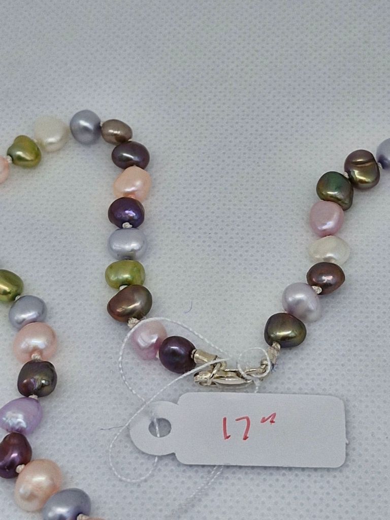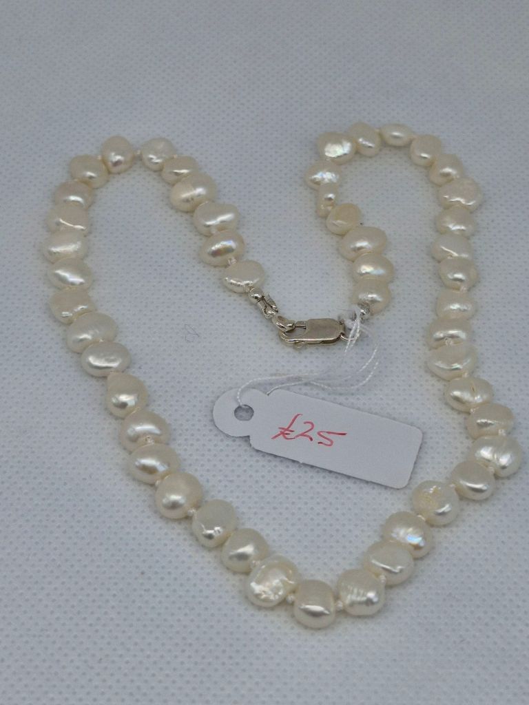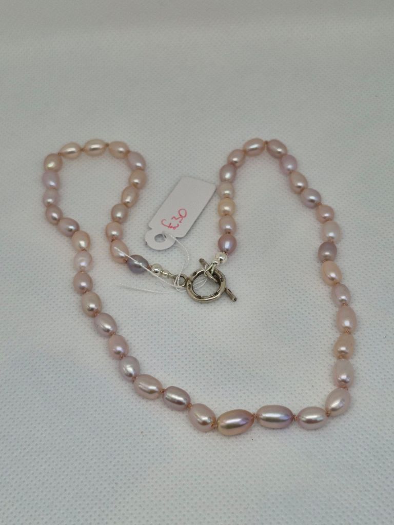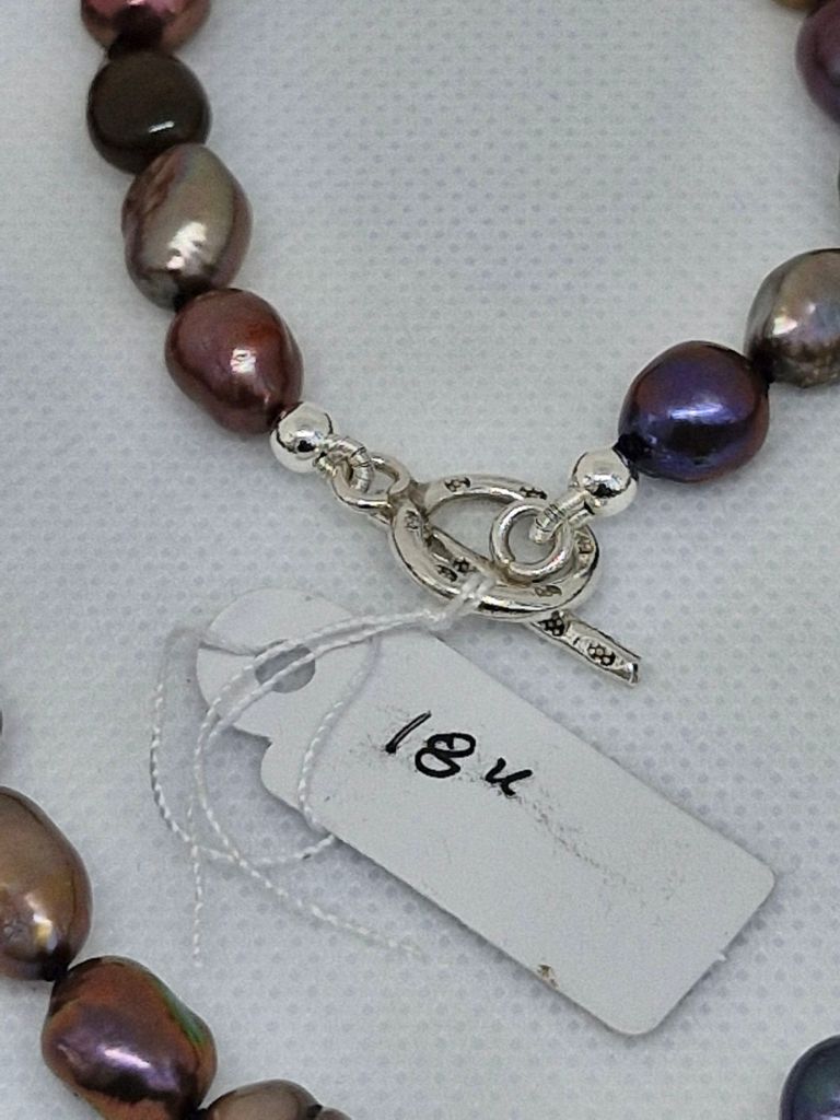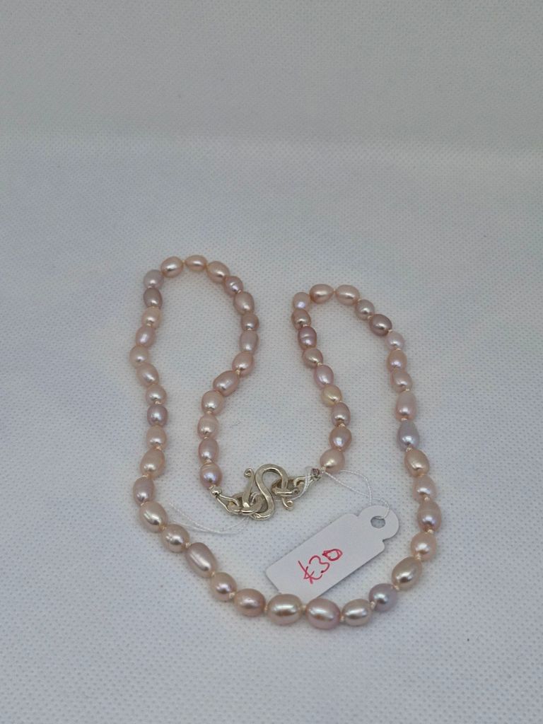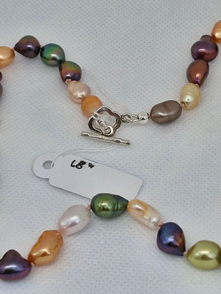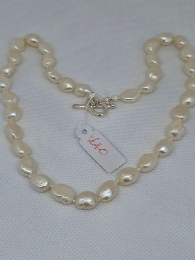 Multicolour baroque pearls £30Deep purple rice pearls £25Peacock pearls with hook clasp £40 1) Multicoloured baroque pearls £301) another view with length shown – 16″ + 2″ extension chain.2) Baroque pearls in beautiful shades of soft pink with a Hill Tribe Silver square toggle clasp. £302) close-up of the clasp & colours. This string is 20″ long3) Gorgeous oval ivory pearls with a round Hill Tribe Silver toggle clasp £303) Close up of the clasp. These are 19″ in length4) Very pale pinks, creams & apricots make a lovely baroque pearl necklace £304) This is a hammered square toggle clasp in sterling silver. The necklace is 17″ long5) Baroque pearls in cream, yellow and apricot with a plain sterling silver lobster clasp. £305) Sparkly beads finish off this 19″ string of pearls 6) Lime green rice pearls £256) 18″ of freshness fastened with a sterling silver lobster clasp. 7) Silver baroque pearls £30 (and there’s a bracelet to match if you’re interested, it’s £20)7) And extension chain will take this string from 16″ to 18″ of shiny luxury.8) A simple string of ivory ‘potato’ pearls. £258) Closer view of the lobster catch on this 18″ necklace 9) Multicoloured baroque pearls go with anything! £309) This string is a longer length at 20″10) More multicoloured pearls, smaller ones this time in softer colours £2510) This string is 17″ long with a lobster clasp 11) Lovely soft pink oval pearls £3011) With the hammered Hill Tribe Silver ‘S’ clasp, these measure 19″12) Another multicoloured baroque necklace, this time with a square Hill Tribe Silver clasp £3012) close up of colours and clasp. This necklace is 18″13) Unusual colour these pearls. A sort of soft pinky-mauve with a touch of silver. Gorgeous. £3013) The extension chain will take this from a 16″ string to 18″, so very versatile. 14) Another baroque string in creams & apricots. This one has a heart toggle clasp in Hill Tribe Silver. £3014) The heart-shaped clasp is a real feature of this 18″ necklace. 15) Large ivory irregular pearls. These are beautiful. £4015) The 18″ string is finished off with an oval hammered Hill Tribe Silver clasp.16) A pretty string of irregular ivory pearls with a lobster catch. £2516) A short length at 15″, so will make a choker, or be good for a child.17) Creams, apricots and yellows with an oval Hill Tribe Silver toggle clasp. £3017) A close up of the pretty clasp on this 18″ necklace 18) Stunning baroque peacock pearls. £4018) close up of the Hill Tribe Silver oval toggle clasp. This necklace is 20″ long.19) These round pearls are an amazing dark green and about 6mm in diameter. £3019) This 17″ necklace is fastened with a square Hill Tribe Silver clasp20) More of the oval pinky-mauve pearls. These have a round toggle clasp £3020) Close up of the pretty Hill Tribe Silver clasp & the colours of this lovely 20″ necklace 21) Deep purple rice pearls with satin effect flat sterling silver beads. £2521) 16″, so a necklet length. There is a bracelet to match at £2022) More deep green 6mm pearls, with a single satin effect round bead as an off-centre focal point. £3522) A close up of the Hill Tribe Silver bead and sterling silver lobster clasp on this 19″ piece23) Browns and bronzes in baroque pearls make a warm necklace for £3023) A round Hill Tribe Silver toggle clasp is a feature point on this 18″ necklace 24) Sweet and simple, dark green 6mm pearls with a lobster clasp £3024) This string is 18″25) These silver grey oval pearls are £3025) The 2″ extension chain will take this 16″ necklace to 18″.26) Deep green 6mm pearls have 3 little sterling silver beads as an asymmetrical feature £3526) 17″ will extend to 19″ with the little chain and lobster clasp