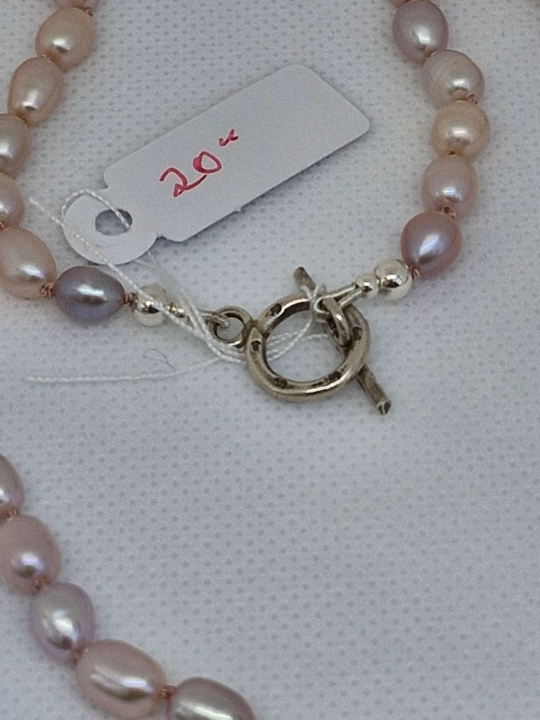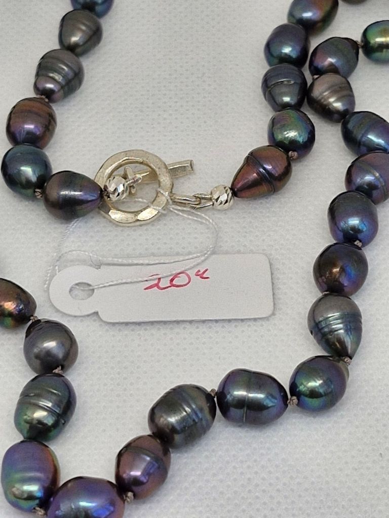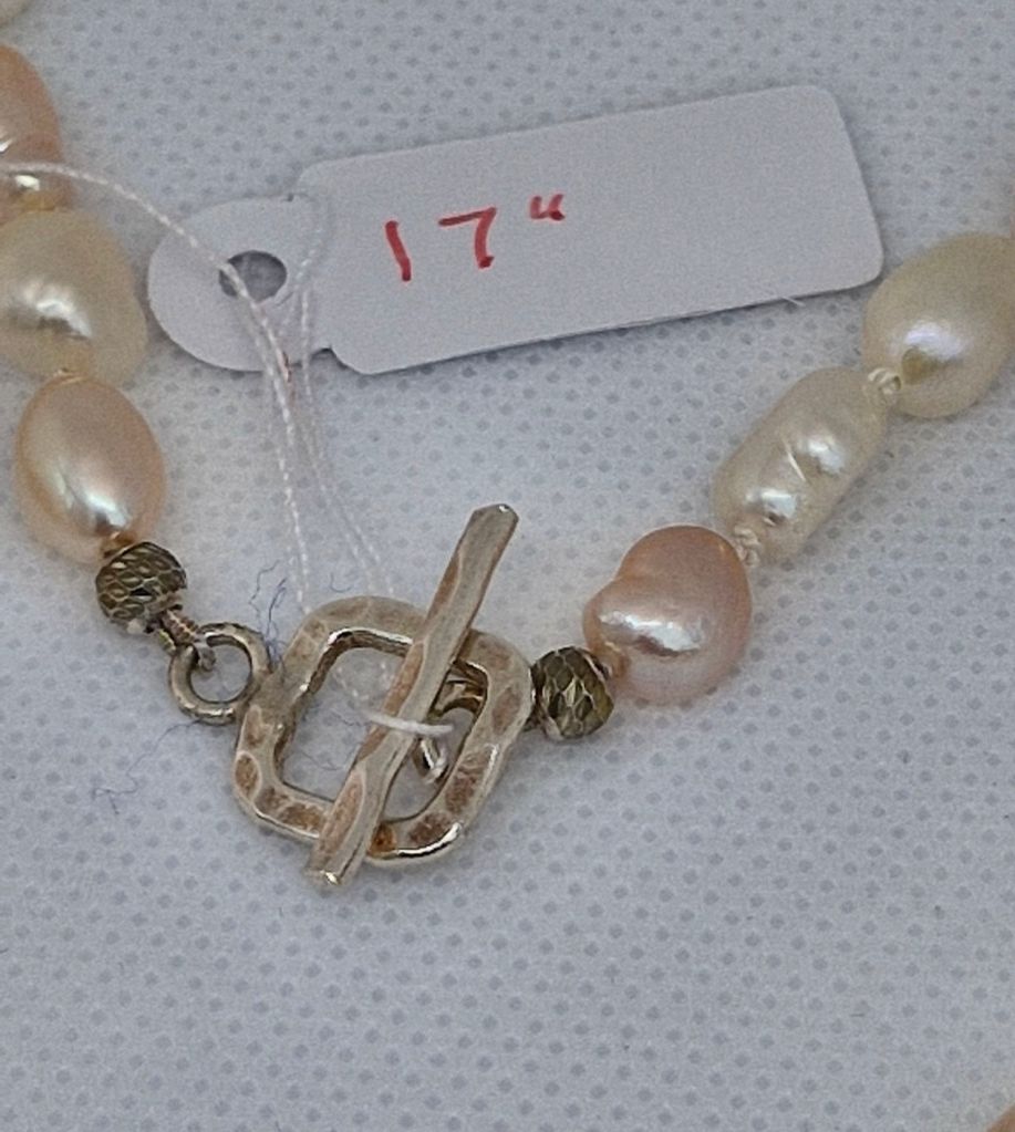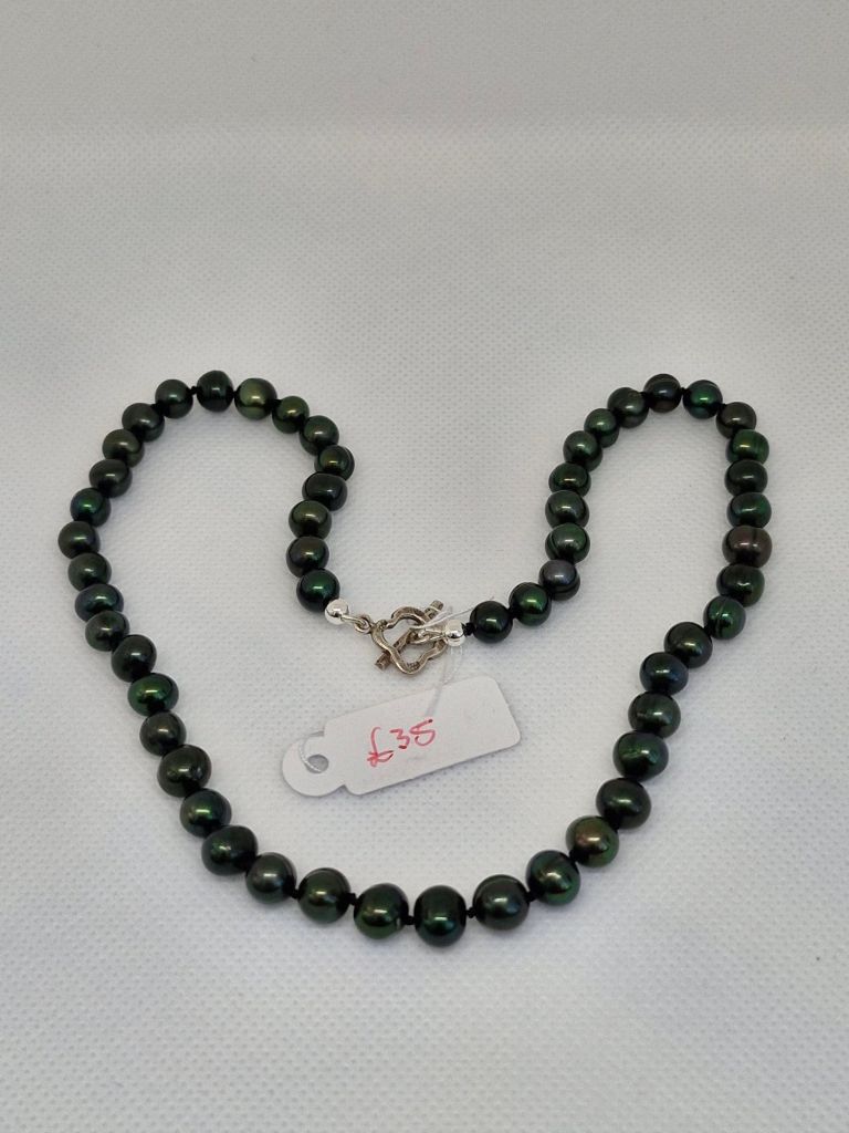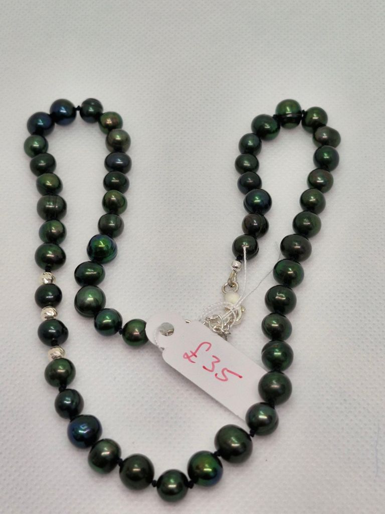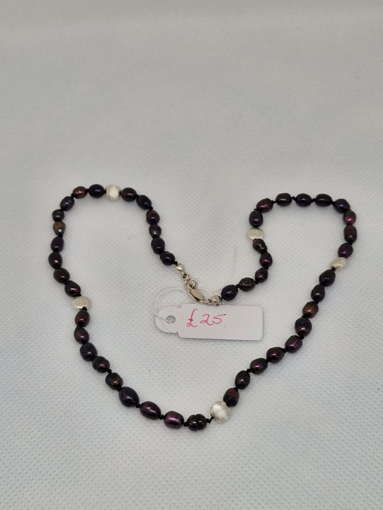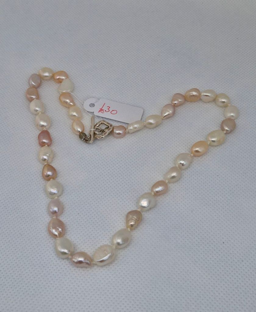 Multicolour baroque pearls £30Deep purple rice pearls £25Peacock pearls with hook clasp £40 1) Multicoloured baroque pearls £301) another view with length shown – 16″ + 2″ extension chain.2) Baroque pearls in beautiful shades of soft pink with a Hill Tribe Silver square toggle clasp. £302) close-up of the clasp & colours. This string is 20″ long3) Gorgeous oval ivory pearls with a round Hill Tribe Silver toggle clasp £303) Close up of the clasp. These are 19″ in length4) Very pale pinks, creams & apricots make a lovely baroque pearl necklace £304) This is a hammered square toggle clasp in sterling silver. The necklace is 17″ long5) Baroque pearls in cream, yellow and apricot with a plain sterling silver lobster clasp. £305) Sparkly beads finish off this 19″ string of pearls 6) Lime green rice pearls £256) 18″ of freshness fastened with a sterling silver lobster clasp. 7) Silver baroque pearls £30 (and there’s a bracelet to match if you’re interested, it’s £20)7) And extension chain will take this string from 16″ to 18″ of shiny luxury.8) A simple string of ivory ‘potato’ pearls. £258) Closer view of the lobster catch on this 18″ necklace 9) Multicoloured baroque pearls go with anything! £309) This string is a longer length at 20″10) More multicoloured pearls, smaller ones this time in softer colours £2510) This string is 17″ long with a lobster clasp 11) Lovely soft pink oval pearls £3011) With the hammered Hill Tribe Silver ‘S’ clasp, these measure 19″12) Another multicoloured baroque necklace, this time with a square Hill Tribe Silver clasp £3012) close up of colours and clasp. This necklace is 18″13) Unusual colour these pearls. A sort of soft pinky-mauve with a touch of silver. Gorgeous. £3013) The extension chain will take this from a 16″ string to 18″, so very versatile. 14) Another baroque string in creams & apricots. This one has a heart toggle clasp in Hill Tribe Silver. £3014) The heart-shaped clasp is a real feature of this 18″ necklace. 15) Large ivory irregular pearls. These are beautiful. £4015) The 18″ string is finished off with an oval hammered Hill Tribe Silver clasp.16) A pretty string of irregular ivory pearls with a lobster catch. £2516) A short length at 15″, so will make a choker, or be good for a child.17) Creams, apricots and yellows with an oval Hill Tribe Silver toggle clasp. £3017) A close up of the pretty clasp on this 18″ necklace 18) Stunning baroque peacock pearls. £4018) close up of the Hill Tribe Silver oval toggle clasp. This necklace is 20″ long.19) These round pearls are an amazing dark green and about 6mm in diameter. £3019) This 17″ necklace is fastened with a square Hill Tribe Silver clasp20) More of the oval pinky-mauve pearls. These have a round toggle clasp £3020) Close up of the pretty Hill Tribe Silver clasp & the colours of this lovely 20″ necklace 21) Deep purple rice pearls with satin effect flat sterling silver beads. £2521) 16″, so a necklet length. There is a bracelet to match at £2022) More deep green 6mm pearls, with a single satin effect round bead as an off-centre focal point. £3522) A close up of the Hill Tribe Silver bead and sterling silver lobster clasp on this 19″ piece23) Browns and bronzes in baroque pearls make a warm necklace for £3023) A round Hill Tribe Silver toggle clasp is a feature point on this 18″ necklace 24) Sweet and simple, dark green 6mm pearls with a lobster clasp £3024) This string is 18″25) These silver grey oval pearls are £3025) The 2″ extension chain will take this 16″ necklace to 18″.26) Deep green 6mm pearls have 3 little sterling silver beads as an asymmetrical feature £3526) 17″ will extend to 19″ with the little chain and lobster clasp