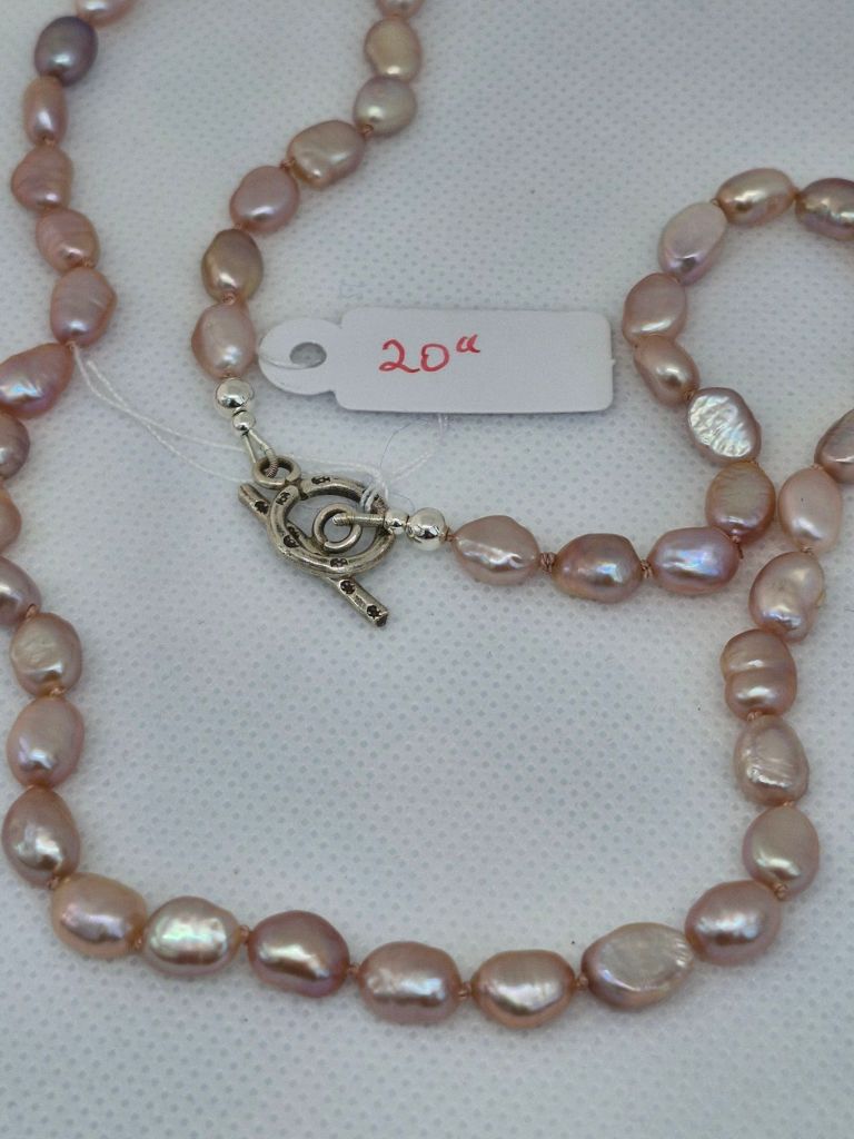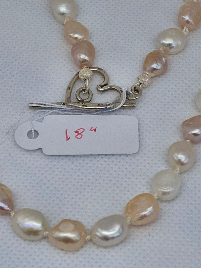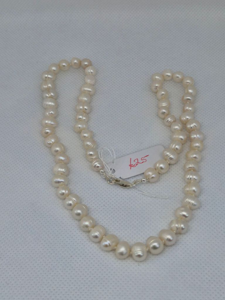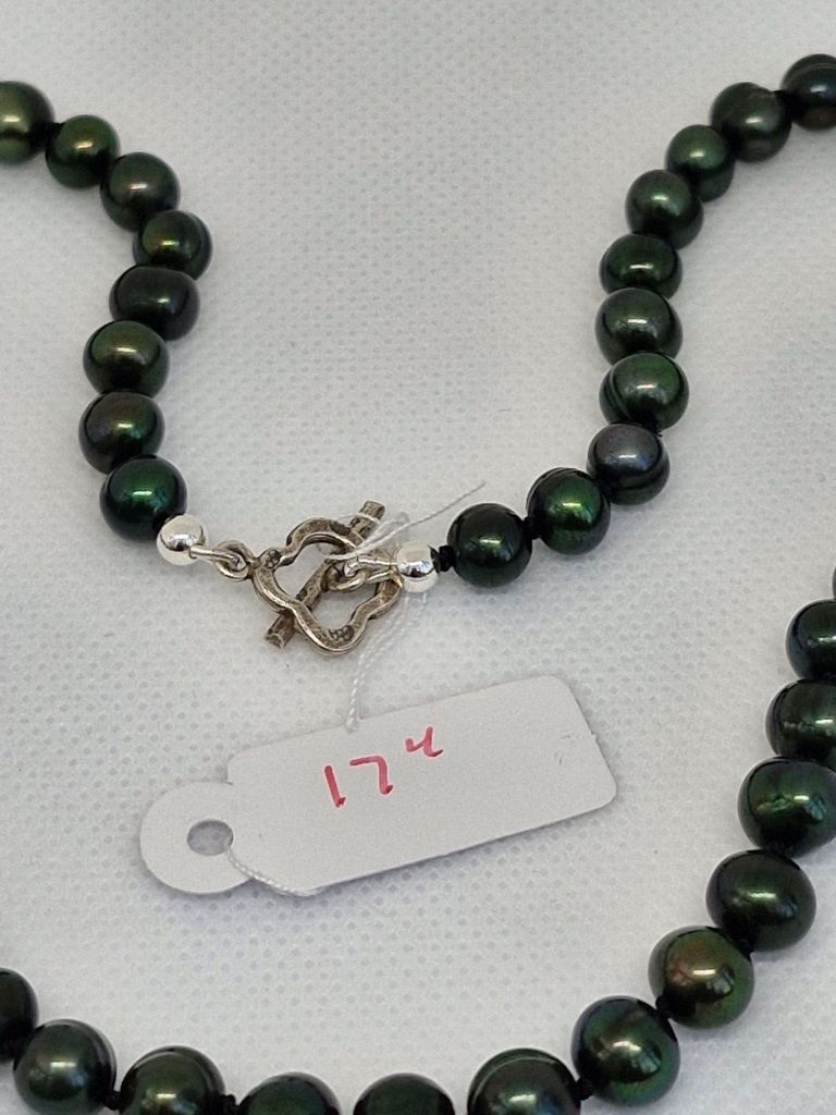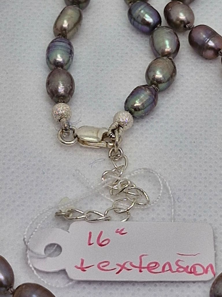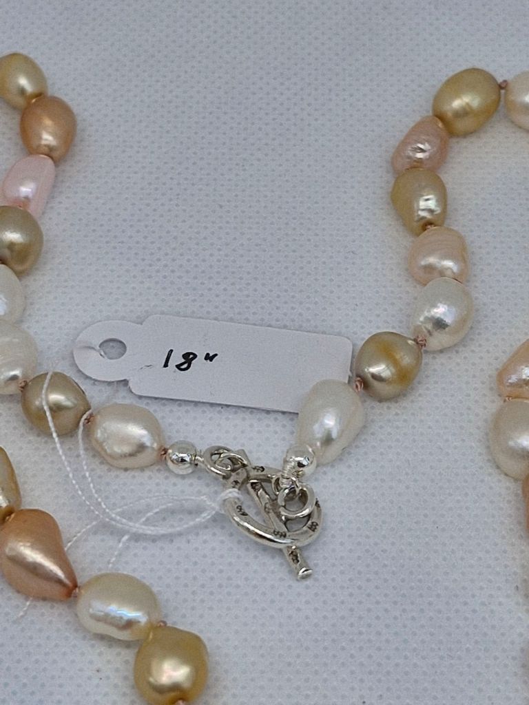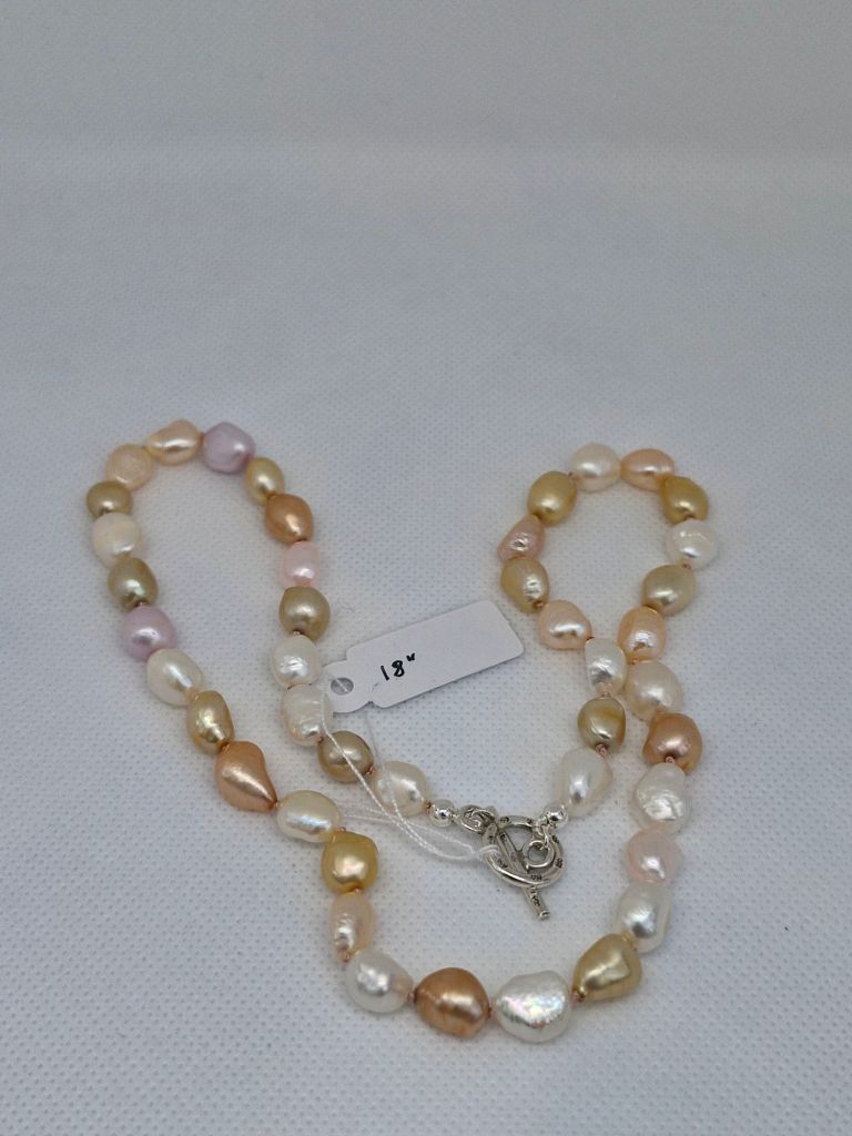 Multicolour baroque pearls £30Deep purple rice pearls £25Peacock pearls with hook clasp £40 1) Multicoloured baroque pearls £301) another view with length shown – 16″ + 2″ extension chain.2) Baroque pearls in beautiful shades of soft pink with a Hill Tribe Silver square toggle clasp. £302) close-up of the clasp & colours. This string is 20″ long3) Gorgeous oval ivory pearls with a round Hill Tribe Silver toggle clasp £303) Close up of the clasp. These are 19″ in length4) Very pale pinks, creams & apricots make a lovely baroque pearl necklace £304) This is a hammered square toggle clasp in sterling silver. The necklace is 17″ long5) Baroque pearls in cream, yellow and apricot with a plain sterling silver lobster clasp. £305) Sparkly beads finish off this 19″ string of pearls 6) Lime green rice pearls £256) 18″ of freshness fastened with a sterling silver lobster clasp. 7) Silver baroque pearls £30 (and there’s a bracelet to match if you’re interested, it’s £20)7) And extension chain will take this string from 16″ to 18″ of shiny luxury.8) A simple string of ivory ‘potato’ pearls. £258) Closer view of the lobster catch on this 18″ necklace 9) Multicoloured baroque pearls go with anything! £309) This string is a longer length at 20″10) More multicoloured pearls, smaller ones this time in softer colours £2510) This string is 17″ long with a lobster clasp 11) Lovely soft pink oval pearls £3011) With the hammered Hill Tribe Silver ‘S’ clasp, these measure 19″12) Another multicoloured baroque necklace, this time with a square Hill Tribe Silver clasp £3012) close up of colours and clasp. This necklace is 18″13) Unusual colour these pearls. A sort of soft pinky-mauve with a touch of silver. Gorgeous. £3013) The extension chain will take this from a 16″ string to 18″, so very versatile. 14) Another baroque string in creams & apricots. This one has a heart toggle clasp in Hill Tribe Silver. £3014) The heart-shaped clasp is a real feature of this 18″ necklace. 15) Large ivory irregular pearls. These are beautiful. £4015) The 18″ string is finished off with an oval hammered Hill Tribe Silver clasp.16) A pretty string of irregular ivory pearls with a lobster catch. £2516) A short length at 15″, so will make a choker, or be good for a child.17) Creams, apricots and yellows with an oval Hill Tribe Silver toggle clasp. £3017) A close up of the pretty clasp on this 18″ necklace 18) Stunning baroque peacock pearls. £4018) close up of the Hill Tribe Silver oval toggle clasp. This necklace is 20″ long.19) These round pearls are an amazing dark green and about 6mm in diameter. £3019) This 17″ necklace is fastened with a square Hill Tribe Silver clasp20) More of the oval pinky-mauve pearls. These have a round toggle clasp £3020) Close up of the pretty Hill Tribe Silver clasp & the colours of this lovely 20″ necklace 21) Deep purple rice pearls with satin effect flat sterling silver beads. £2521) 16″, so a necklet length. There is a bracelet to match at £2022) More deep green 6mm pearls, with a single satin effect round bead as an off-centre focal point. £3522) A close up of the Hill Tribe Silver bead and sterling silver lobster clasp on this 19″ piece23) Browns and bronzes in baroque pearls make a warm necklace for £3023) A round Hill Tribe Silver toggle clasp is a feature point on this 18″ necklace 24) Sweet and simple, dark green 6mm pearls with a lobster clasp £3024) This string is 18″25) These silver grey oval pearls are £3025) The 2″ extension chain will take this 16″ necklace to 18″.26) Deep green 6mm pearls have 3 little sterling silver beads as an asymmetrical feature £3526) 17″ will extend to 19″ with the little chain and lobster clasp