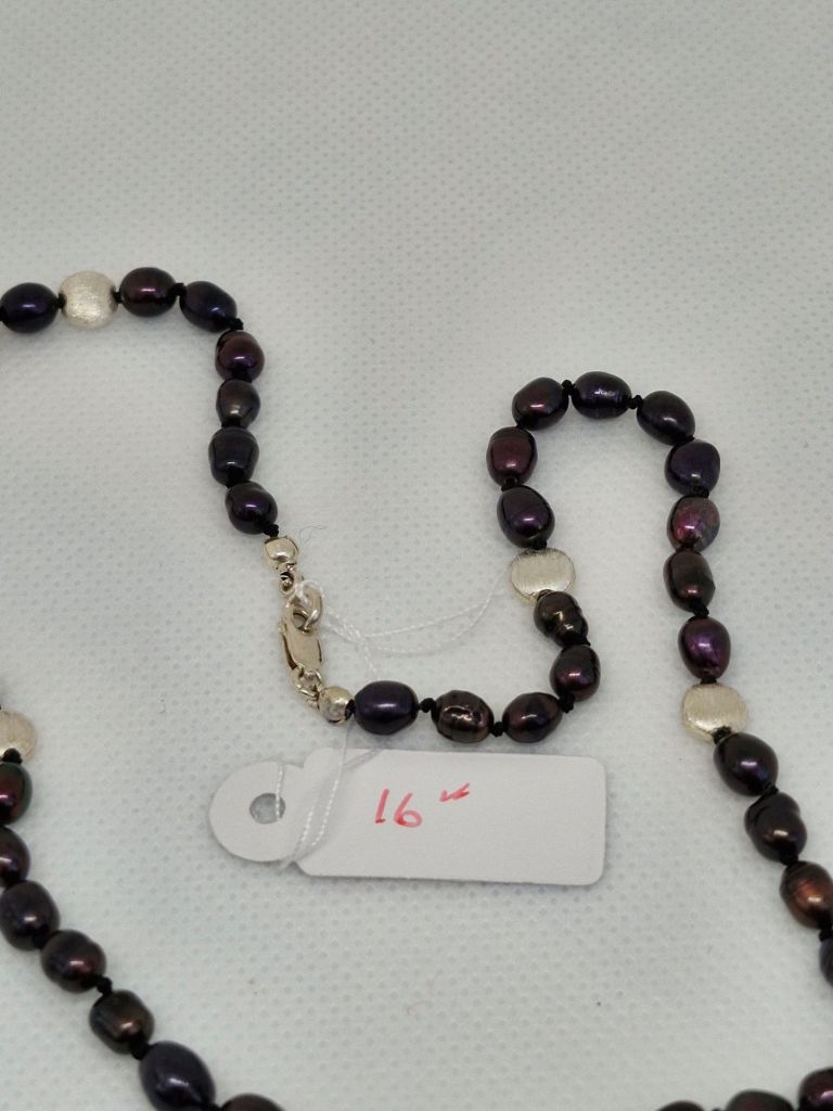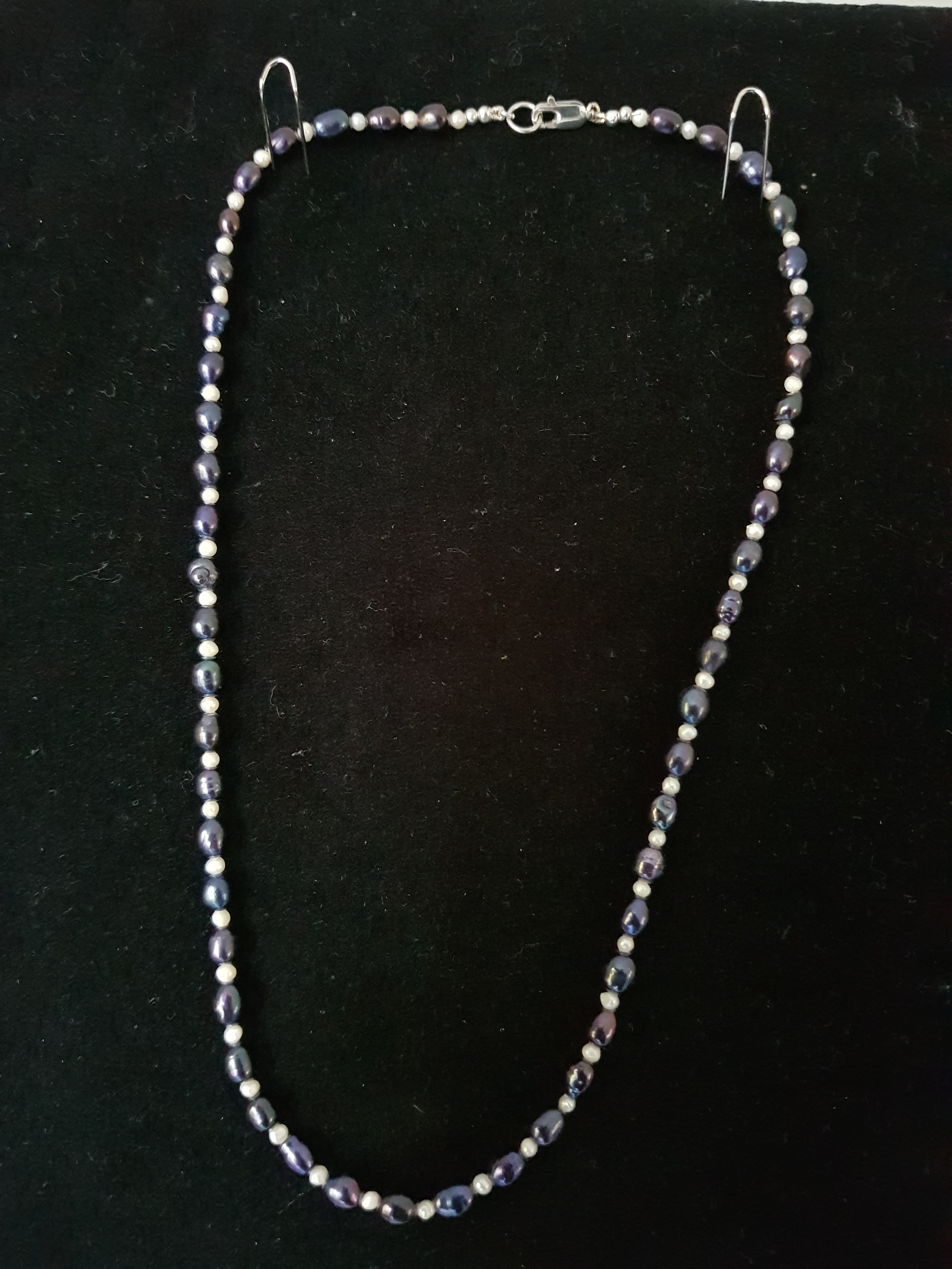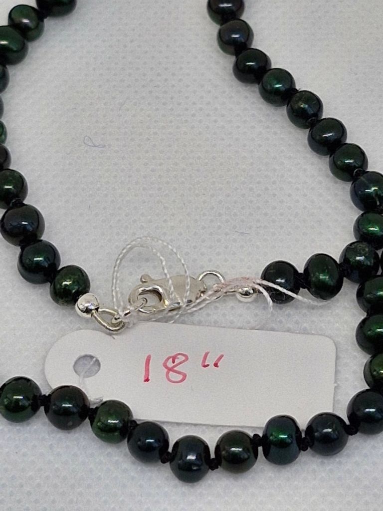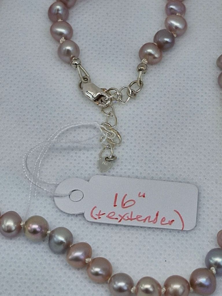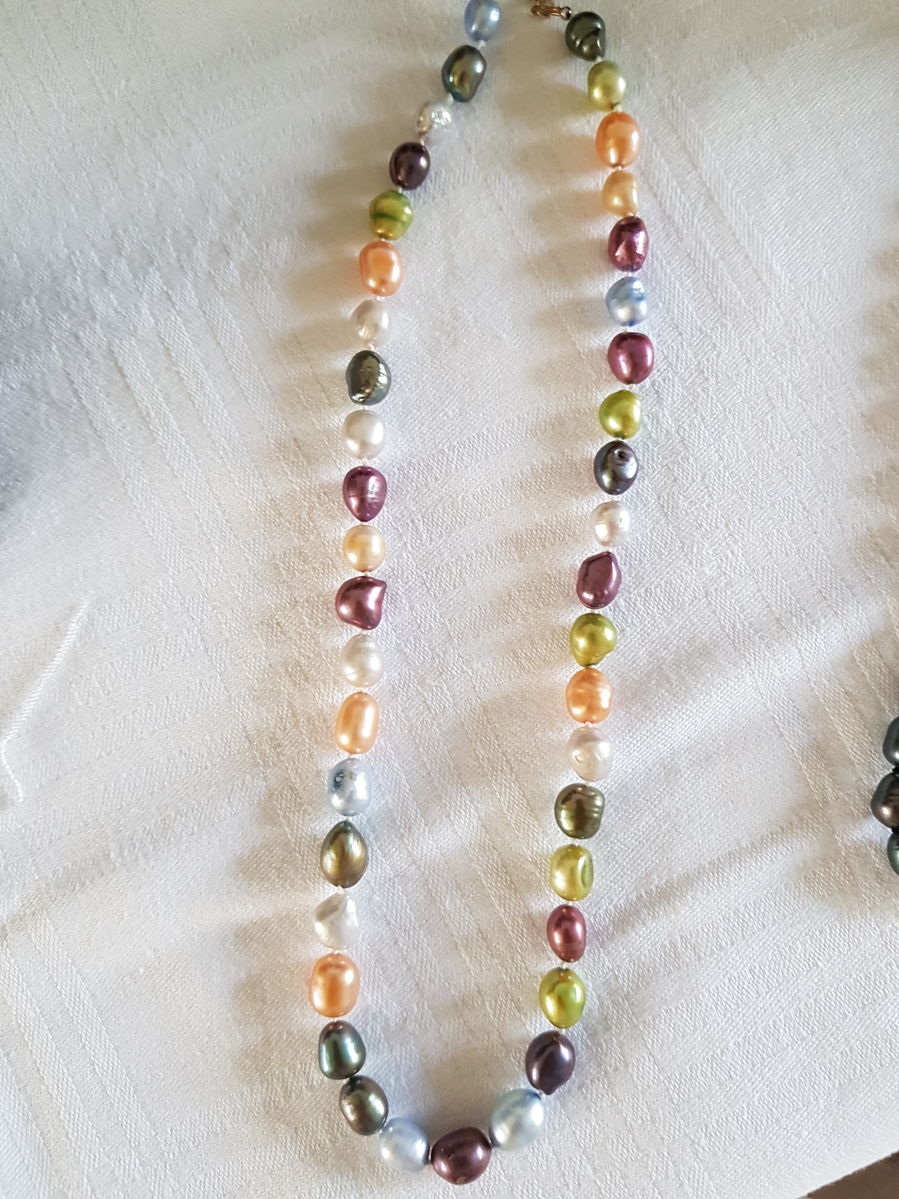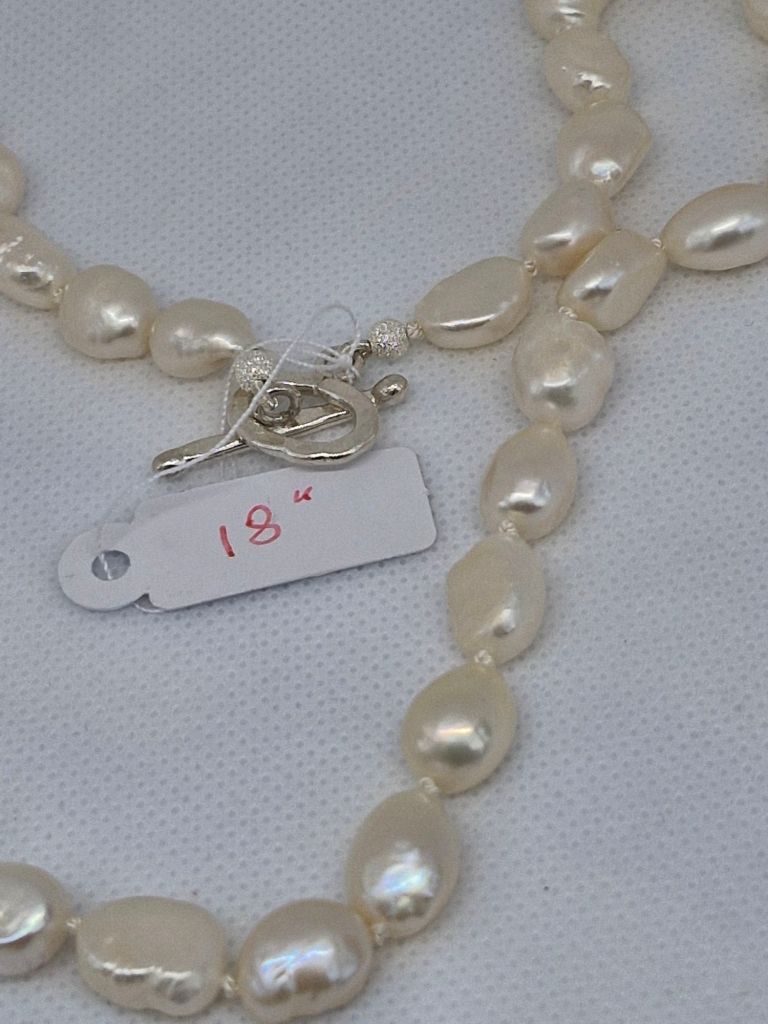 Multicolour baroque pearls £30Deep purple rice pearls £25Peacock pearls with hook clasp £40 1) Multicoloured baroque pearls £301) another view with length shown – 16″ + 2″ extension chain.2) Baroque pearls in beautiful shades of soft pink with a Hill Tribe Silver square toggle clasp. £302) close-up of the clasp & colours. This string is 20″ long3) Gorgeous oval ivory pearls with a round Hill Tribe Silver toggle clasp £303) Close up of the clasp. These are 19″ in length4) Very pale pinks, creams & apricots make a lovely baroque pearl necklace £304) This is a hammered square toggle clasp in sterling silver. The necklace is 17″ long5) Baroque pearls in cream, yellow and apricot with a plain sterling silver lobster clasp. £305) Sparkly beads finish off this 19″ string of pearls 6) Lime green rice pearls £256) 18″ of freshness fastened with a sterling silver lobster clasp. 7) Silver baroque pearls £30 (and there’s a bracelet to match if you’re interested, it’s £20)7) And extension chain will take this string from 16″ to 18″ of shiny luxury.8) A simple string of ivory ‘potato’ pearls. £258) Closer view of the lobster catch on this 18″ necklace 9) Multicoloured baroque pearls go with anything! £309) This string is a longer length at 20″10) More multicoloured pearls, smaller ones this time in softer colours £2510) This string is 17″ long with a lobster clasp 11) Lovely soft pink oval pearls £3011) With the hammered Hill Tribe Silver ‘S’ clasp, these measure 19″12) Another multicoloured baroque necklace, this time with a square Hill Tribe Silver clasp £3012) close up of colours and clasp. This necklace is 18″13) Unusual colour these pearls. A sort of soft pinky-mauve with a touch of silver. Gorgeous. £3013) The extension chain will take this from a 16″ string to 18″, so very versatile. 14) Another baroque string in creams & apricots. This one has a heart toggle clasp in Hill Tribe Silver. £3014) The heart-shaped clasp is a real feature of this 18″ necklace. 15) Large ivory irregular pearls. These are beautiful. £4015) The 18″ string is finished off with an oval hammered Hill Tribe Silver clasp.16) A pretty string of irregular ivory pearls with a lobster catch. £2516) A short length at 15″, so will make a choker, or be good for a child.17) Creams, apricots and yellows with an oval Hill Tribe Silver toggle clasp. £3017) A close up of the pretty clasp on this 18″ necklace 18) Stunning baroque peacock pearls. £4018) close up of the Hill Tribe Silver oval toggle clasp. This necklace is 20″ long.19) These round pearls are an amazing dark green and about 6mm in diameter. £3019) This 17″ necklace is fastened with a square Hill Tribe Silver clasp20) More of the oval pinky-mauve pearls. These have a round toggle clasp £3020) Close up of the pretty Hill Tribe Silver clasp & the colours of this lovely 20″ necklace 21) Deep purple rice pearls with satin effect flat sterling silver beads. £2521) 16″, so a necklet length. There is a bracelet to match at £2022) More deep green 6mm pearls, with a single satin effect round bead as an off-centre focal point. £3522) A close up of the Hill Tribe Silver bead and sterling silver lobster clasp on this 19″ piece23) Browns and bronzes in baroque pearls make a warm necklace for £3023) A round Hill Tribe Silver toggle clasp is a feature point on this 18″ necklace 24) Sweet and simple, dark green 6mm pearls with a lobster clasp £3024) This string is 18″25) These silver grey oval pearls are £3025) The 2″ extension chain will take this 16″ necklace to 18″.26) Deep green 6mm pearls have 3 little sterling silver beads as an asymmetrical feature £3526) 17″ will extend to 19″ with the little chain and lobster clasp